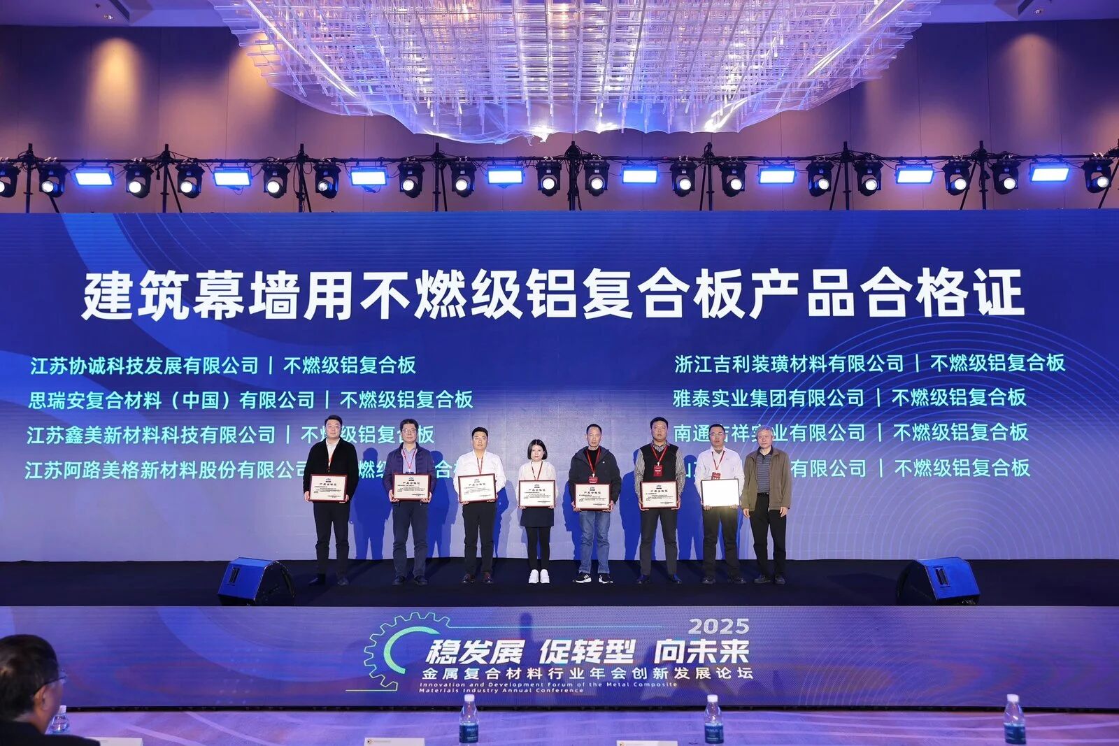 雅泰實業(yè)集團參加本次年會,會上,集團的氟碳液體噴涂鋁單板、不燃級鋁復(fù)合板、鋁波紋芯復(fù)合鋁板等產(chǎn)品分別榮獲“新國標,高質(zhì)量”產(chǎn)品合格證。