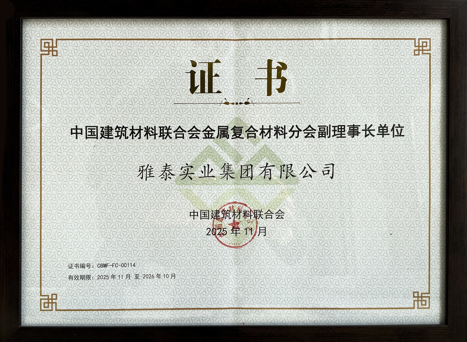 同時,雅泰實業(yè)集團作為幕墻行業(yè)優(yōu)秀的國內(nèi)老字號品牌,也長年擔任著中國建筑材料聯(lián)合會理事、金屬復(fù)合材料分會副理事長等角色。