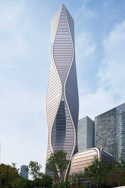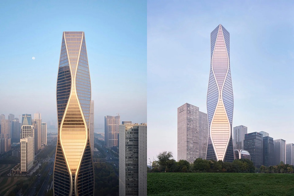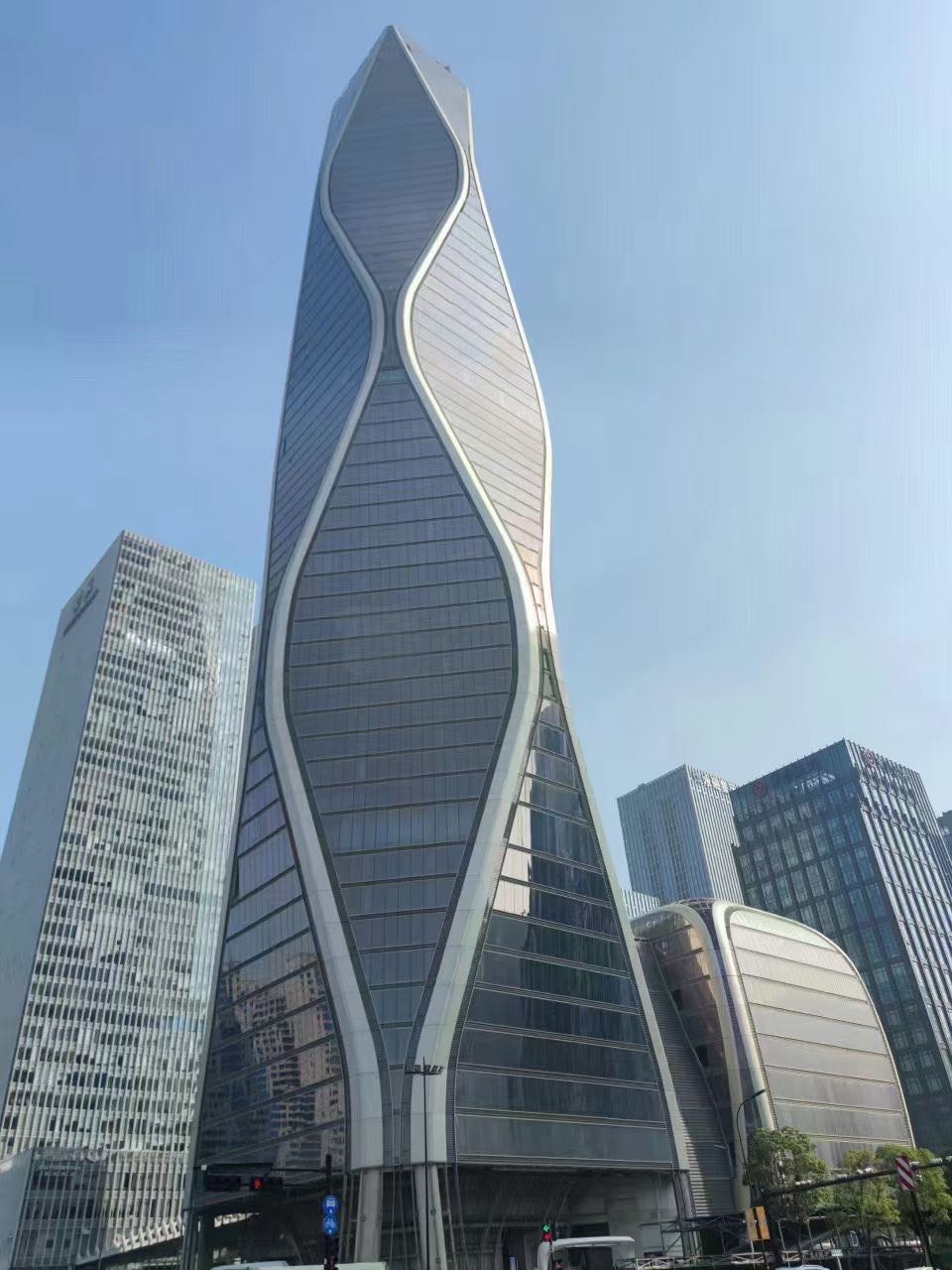 12.5 萬平方米的塔樓,造型獨(dú)特,沿著脈動(dòng)的曲線向著云端升騰,讓人聯(lián)想到錢塘江漣漪的波紋。