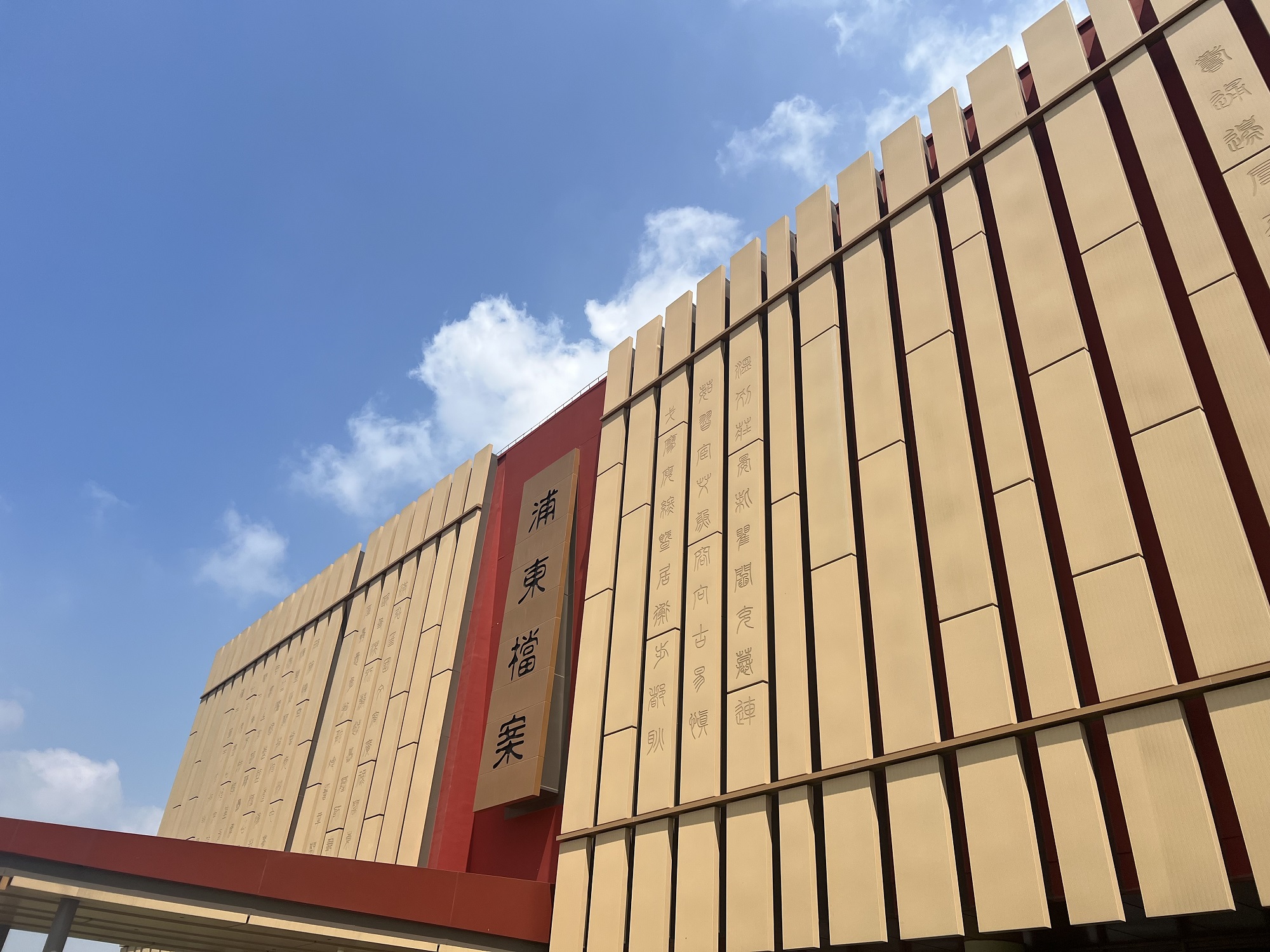 當(dāng)走近位于百潤路100號的上海浦東新區(qū)檔案館時,瞬間被這座充滿中國文化底蘊,用一方方紅色印章與一片片原色竹簡,巧妙搭配的建筑深深吸引。