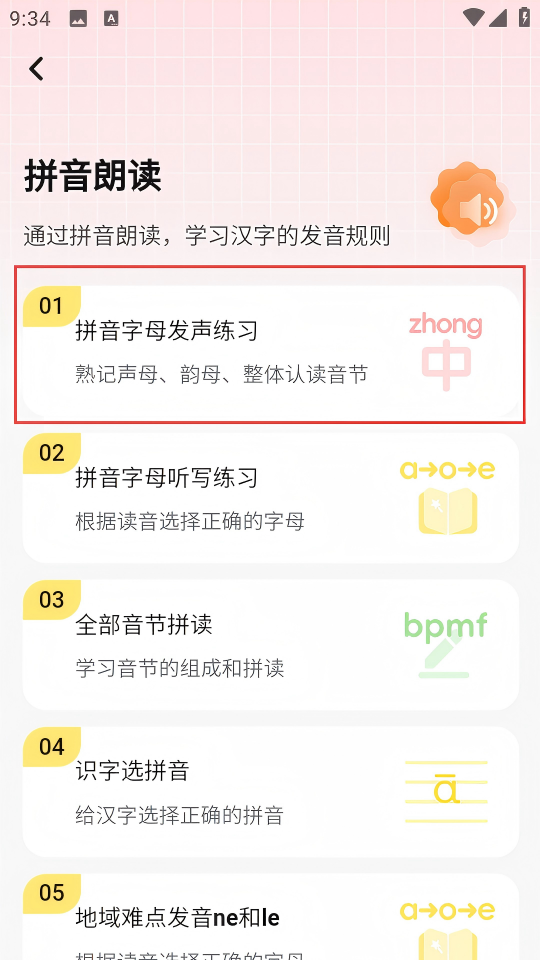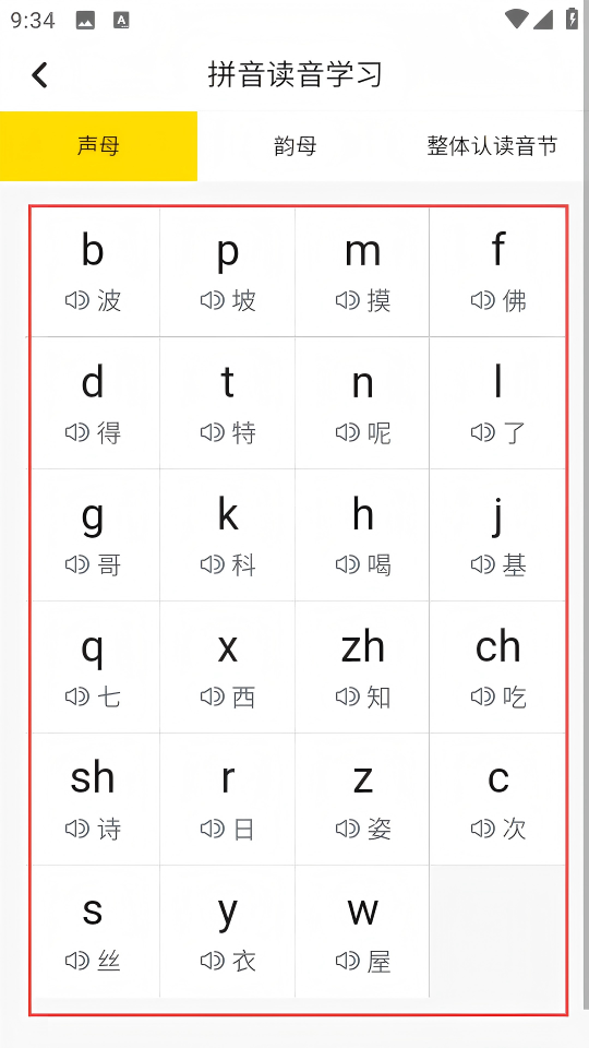 4、進(jìn)入【聲母】欄,點(diǎn)擊字母旁喇叭,聆聽發(fā)音,學(xué)習(xí)聲母讀寫。