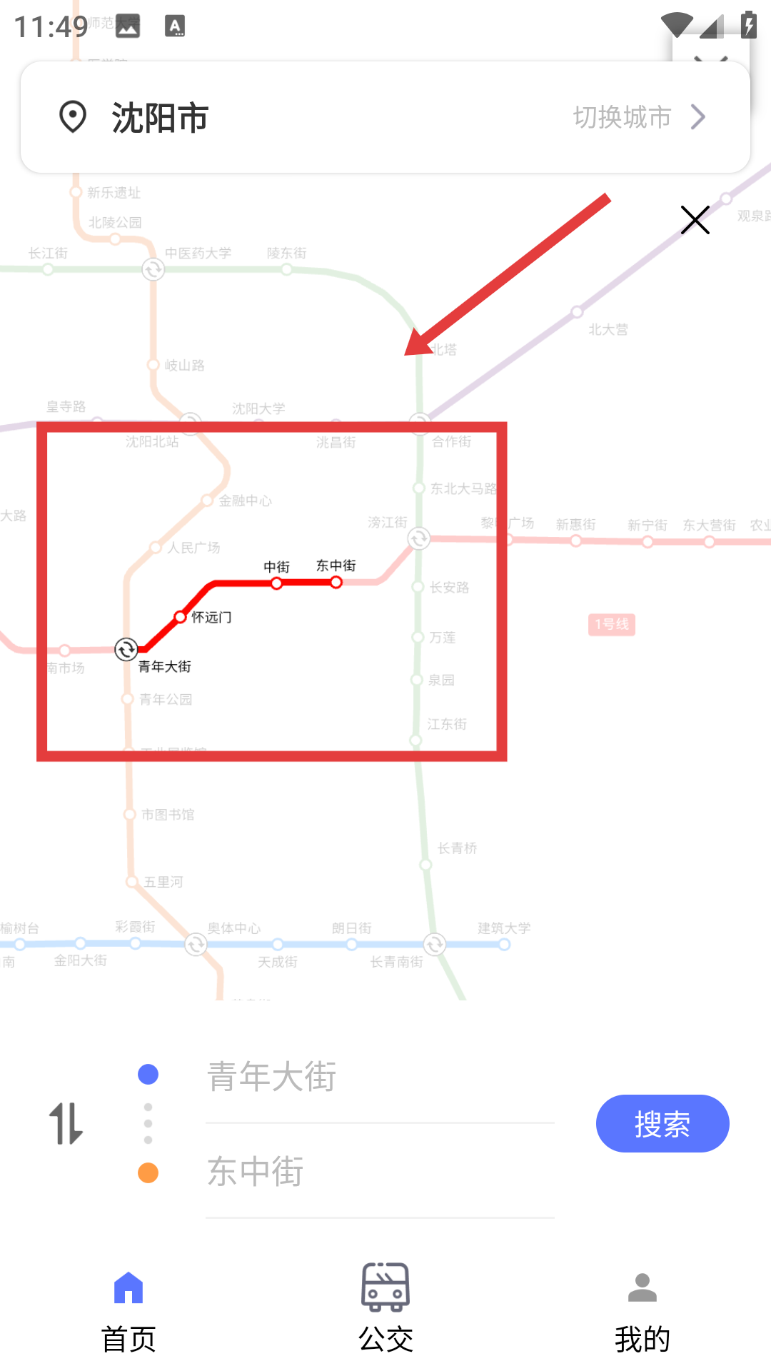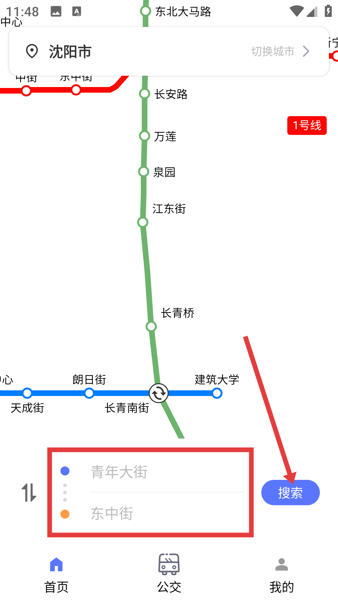 3、在沈陽市地鐵界面,輸入起點(如【青年大街】)與終點(如【東中街】),點擊【搜索】。