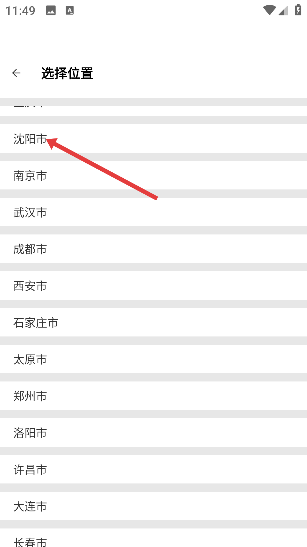 2、在【選擇位置】頁面,點擊【沈陽市】,切換至沈陽市的地鐵線路展示界面。