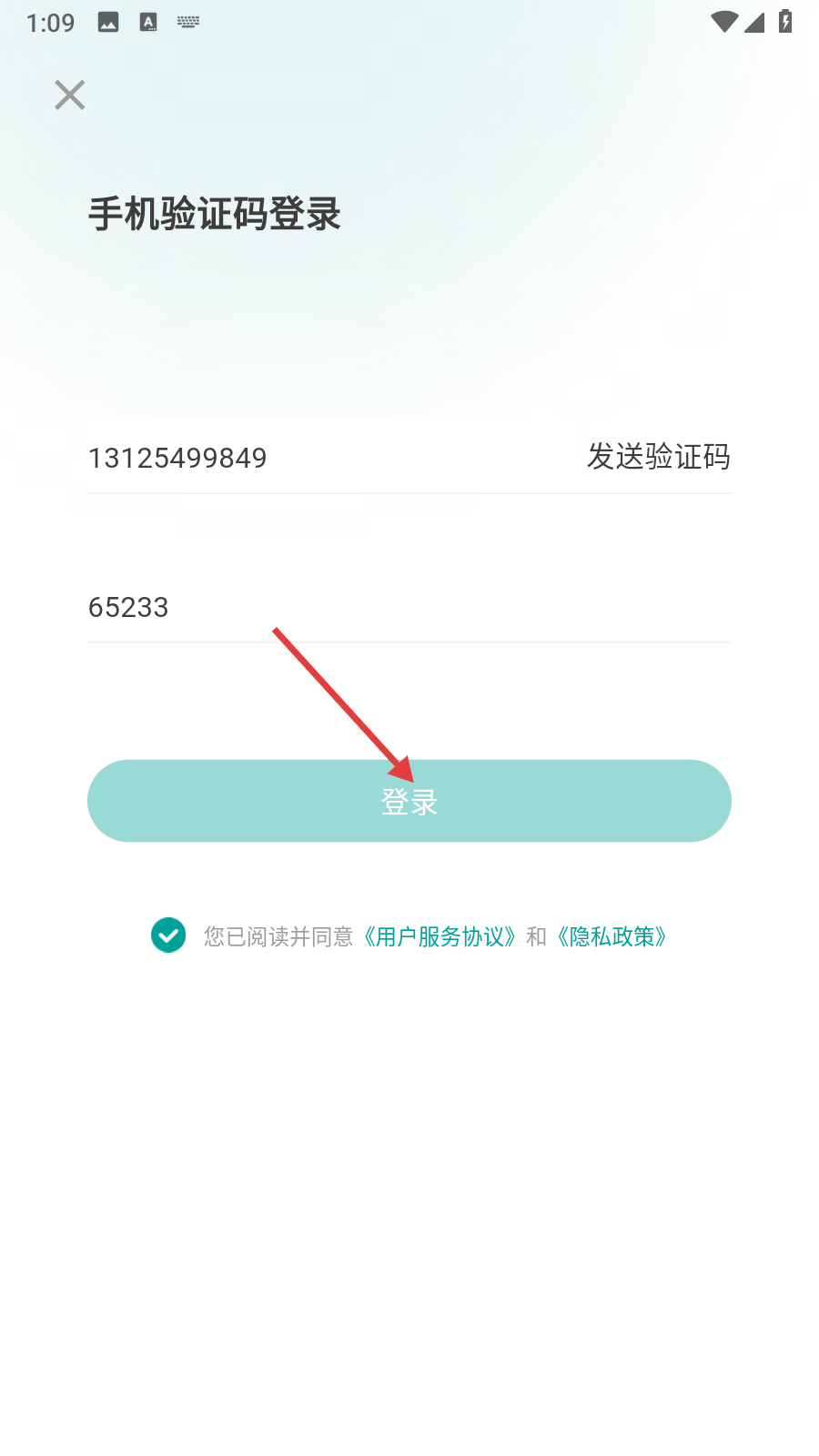 4、輸入好手機號和驗證碼后,點擊【登錄】按鈕完成登錄。