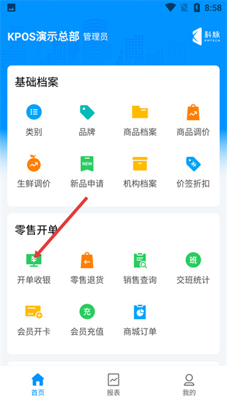 1、進(jìn)入【KPOS-演示總部】首頁,在【零售開單】板塊找到【開單收銀】選項(xiàng)并點(diǎn)擊,即可進(jìn)入收銀操作的前置界面。