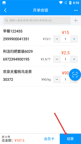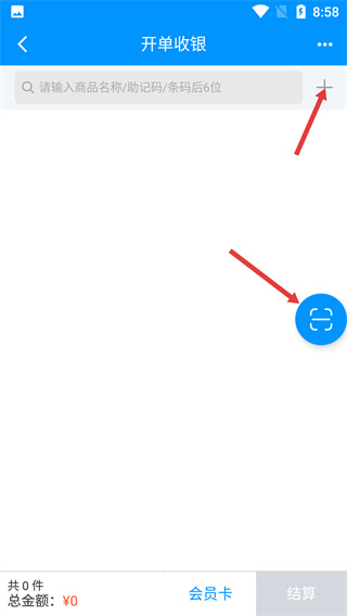 2、進(jìn)入【開單收銀】界面后,可通過【請(qǐng)輸入商品名稱/助記碼/條碼后6位】搜索框填信息,或點(diǎn)擊右上角加號(hào)、右側(cè)藍(lán)色按鈕添加商品。