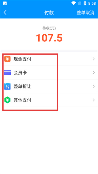 4、進(jìn)入【付款】界面后,待收金額清晰呈現(xiàn),可選擇【現(xiàn)金支付】【會(huì)員卡】等方式,完成該筆訂單的收款操作。