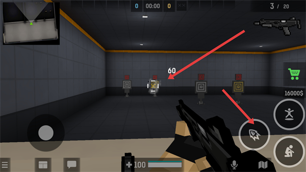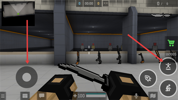 3、進入游戲場景后左側(cè)虛擬搖桿可控制角色移動,右側(cè)按鈕包含武器切換動作等功能,場景內(nèi)展示多種槍械靠近可進行拾取。