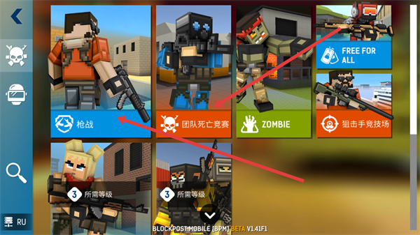 2、在模式選擇界面可看到多種玩法選項,點擊槍戰(zhàn)模式卡片即可進入對應(yīng)玩法,部分模式需滿足等級條件才能解鎖按需選擇已開放的模式開啟對局。