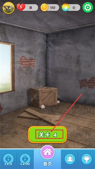 1、進入界面后,確認【5】點生命值-滿、【110】金幣等資源狀態(tài),點擊【關(guān)卡4】按鈕進入該關(guān)卡,開啟花卉合成挑戰(zhàn)。