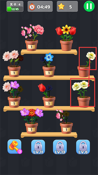 2、在關(guān)卡內(nèi)將同種類花卉(如白色花朵)拖拽合并到同一花盆,推進【12/45】的關(guān)卡進度,同時留意【04:49】的計時。