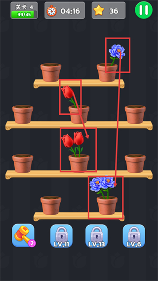 3、繼續(xù)合并同類型花卉(如紅花-藍花),利用現(xiàn)有道具優(yōu)化合成效率,推進至【39/45】的關(guān)卡進度,積累【36】星星。