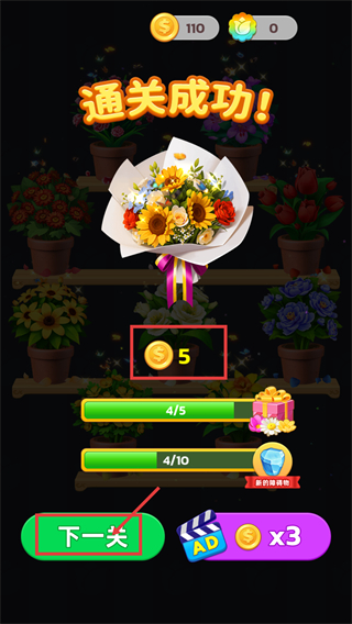4、通關(guān)后獲得【5】金幣獎勵,查看進度條完成情況,點擊【下一關(guān)】按鈕進入后續(xù)花卉合成關(guān)卡,可選擇觀看AD獲取更多獎勵。