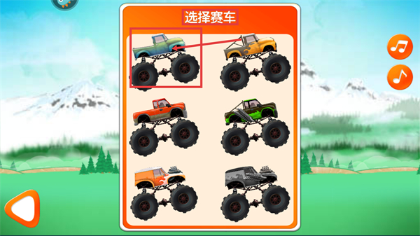 1、進(jìn)入【選擇賽車】界面后,可挑選心儀的大腳車賽車,選好后即可開啟賽事。