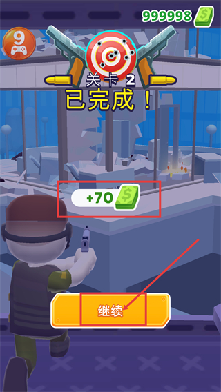 4、關(guān)卡完成后將獲得【+70-貨幣】獎(jiǎng)勵(lì),點(diǎn)擊【繼續(xù)】按鈕可進(jìn)入下一個(gè)關(guān)卡。