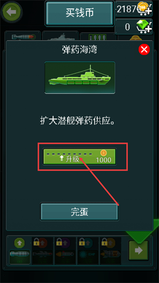 1、在【彈藥海灣】界面消耗【1000-貨幣】點(diǎn)擊【升級】,可擴(kuò)大潛艦的彈藥供應(yīng)儲備,提升作戰(zhàn)能力。