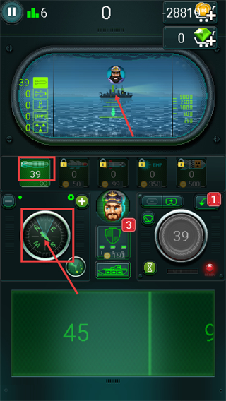 3、攻擊后彈藥數(shù)量會減少,需通過【指南針】調(diào)整潛艦方向,持續(xù)鎖定目標(biāo)艦船推進(jìn)戰(zhàn)斗。