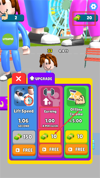 1、消耗【10-貨幣】升級(jí)【Earning】屬性,提升每次點(diǎn)擊的收益,同時(shí)可通過【FREE】按鈕免費(fèi)獲取資源。