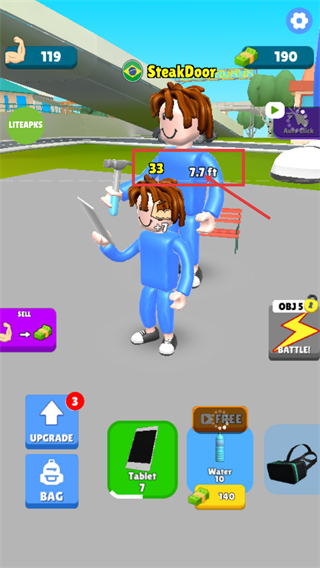 3、角色身高提升至【7.7ft】,裝備【Tablet-7】道具可增加屬性值,同時(shí)積累貨幣資源用于升級(jí)。
