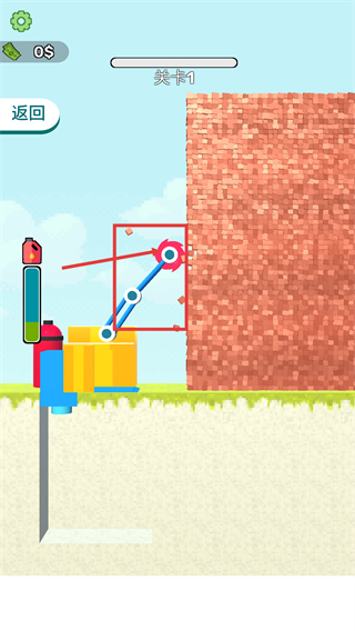 1、在【關(guān)卡1】中操控機(jī)械臂的旋轉(zhuǎn)鋸片,對(duì)準(zhǔn)墻體進(jìn)行切割,同時(shí)留意左側(cè)【汽油】余量確保續(xù)航。