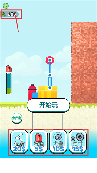 4、關(guān)卡結(jié)束后獲得【60$】,可消耗貨幣升級(jí)【長(zhǎng)度-20$】【汽油-5$】等屬性,提升下一輪切割效率。